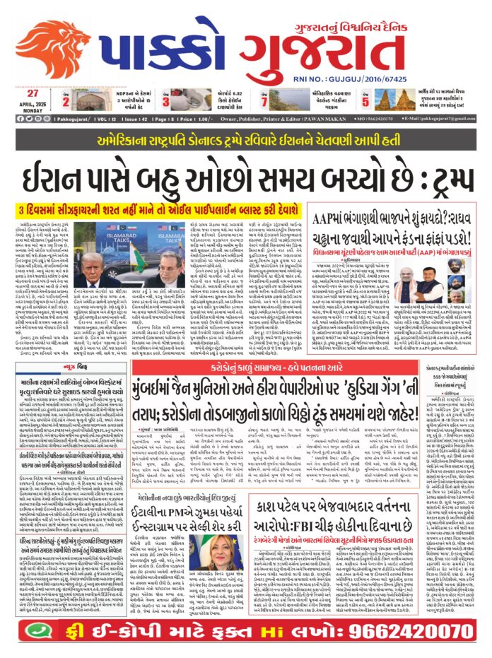 HomeepaperPAKKO GUJARAT : 27-04-2026 PAKKO GUJARAT : 27-04-2026 By pakkogujarat April 27, 2026 0 1331 Share FacebookXPinterestWhatsApp PAKKO_GUJARAT_27-04-2026Download Share FacebookXPinterestWhatsApp Previous articleRashi : 27 એપ્રિલ 2026નું રાશિ ભવિષ્યNext articleArticle : નવી પેઢી, નવો સંકલ્પ: આધુનિક માનતા સંકલ્પથી સિદ્ધિ: આધુનિક યુગમાં બાધાનું નવું પરિમાણ pakkogujarathttps://pakkogujarat.com/ RELATED ARTICLES epaper PAKKO GUJARAT : 26-04-2026 April 26, 2026 epaper PAKKO GUJARAT : 25-04-2026 April 25, 2026 epaper PAKKO GUJARAT : 24-04-2026 April 24, 2026 LEAVE A REPLY Cancel reply Comment: Please enter your comment! Name:* Please enter your name here Email:* You have entered an incorrect email address! Please enter your email address here Website: Save my name, email, and website in this browser for the next time I comment. - Advertisment - Most Popular National : પીએમ મોદી આજે સિક્કિમની મુલાકાત લેશે, એક ખાસ કાર્યક્રમમાં હાજરી આપશે અને 4000 કરોડ રૂપિયાના પ્રોજેક્ટનું ઉદ્ઘાટન કરશે. April 27, 2026 National : રાઘવ ચઢ્ઢા સહિત 7 સાંસદોની મુશ્કેલી વધશે: સંજય સિંહના એક પત્રથી રાજકારણમાં મોટો ભૂકંપ! April 27, 2026 NATIONAL : ભારત-ન્યુઝીલેન્ડ વચ્ચે ઐતિહાસિક મુક્ત વેપાર કરાર થશે! April 27, 2026 National : બંગાળમાં, પીએમએ કહ્યું, “ભાજપનો વિજય નિશ્ચિત છે, ટીએમસી સરકારમાં માતૃભૂમિ અને માનવતા માટે કોઈ આદર નથી.” …. April 27, 2026 Load more Recent Comments