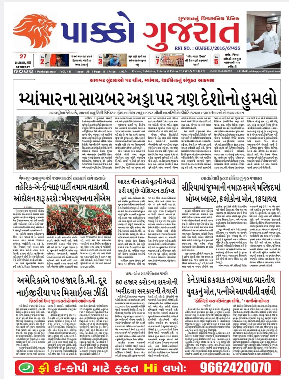 HomeepaperPAKKO GUJARAT : 27-12-2025 PAKKO GUJARAT : 27-12-2025 By pakkogujarat December 27, 2025 0 636 Share FacebookTwitterPinterestWhatsApp PAKKO_GUJARAT_27-12-2025Download Share FacebookTwitterPinterestWhatsApp Previous articleNational : દિલ્હી યુનિવર્સિટીમાં વીર બાલ દિવસની ઉજવણીNext articleGujarat : પાલનપુર રામદેવ હોટલ નજીક યુવકની થયેલી હત્યાનો ભેદ ઉકેલાયો:પોલીસે 6 શખ્સોને ઝડપી લીધા pakkogujarathttps://pakkogujarat.com/ RELATED ARTICLES epaper PAKKO GUJARAT : 02-03-2026 March 2, 2026 epaper PAKKO GUJARAT : 01-03-2026 March 1, 2026 epaper PAKKO GUJARAT : 28-02-2026 February 28, 2026 LEAVE A REPLY Cancel reply Comment: Please enter your comment! Name:* Please enter your name here Email:* You have entered an incorrect email address! Please enter your email address here Website: Save my name, email, and website in this browser for the next time I comment. - Advertisment - Most Popular Entertainment : ‘મારે ઘરે જવું છે…’, યુદ્ધ વચ્ચે અબુ ધાબીમાં ફસાઈ બોલિવૂડ એક્ટ્રેસ, UAE સરકારના કર્યા વખાણ March 2, 2026 Valsad : વાપીમાં રીક્ષામાંથી 13.730 કિલોગ્રામ ગાંજાનો જથ્થો પકડાયો : પાંચની ધરપકડ, બે વોન્ટેડ March 2, 2026 National : ખામેનેઈના મોત મુદ્દે જમ્મુ-કાશ્મીરમાં હિંસક દેખાવો, ટોળાને વિખેરવા લાઠીચાર્જ, ટિયર ગેસના શેલ છોડ્યા March 2, 2026 Delhi : ઈરાન-અમેરિકા યુદ્ધની અસરને પગલે અમેરિકન દૂતાવાસ ખાતે સુરક્ષા વધારી દેવાઈ, ચુસ્ત બંદોબસ્ત ગોઠવાયો March 2, 2026 Load more Recent Comments
