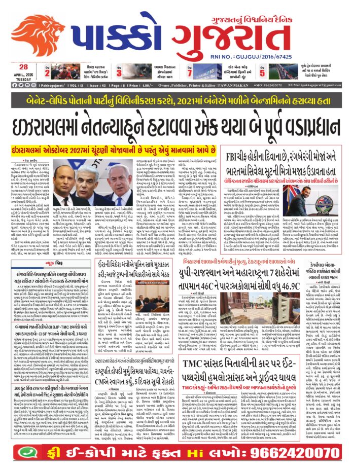 HomeepaperPAKKO GUJARAT : 28-04-2026 PAKKO GUJARAT : 28-04-2026 By pakkogujarat April 28, 2026 0 1344 Share FacebookXPinterestWhatsApp PAKKO_GUJARAT_28-04-2026Download Share FacebookXPinterestWhatsApp Previous articleEntertainment : કાંતારા વિવાદમાં રણવીરની માફી સ્વીકારી કેસ બંધ કરવા હાઈકોર્ટ સંમતNext articleWorld : ટ્રમ્પે રાષ્ટ્રીય સુરક્ષા ટીમ સાથે ઈરાનના નવા પ્રસ્તાવની ચર્ચા કરી, જેમાં હોર્મુઝ અને પરમાણુ મુદ્દાઓ કેન્દ્રમાં છે. pakkogujarathttps://pakkogujarat.com/ RELATED ARTICLES epaper PAKKO GUJARAT : 27-04-2026 April 27, 2026 epaper PAKKO GUJARAT : 26-04-2026 April 26, 2026 epaper PAKKO GUJARAT : 25-04-2026 April 25, 2026 LEAVE A REPLY Cancel reply Comment: Please enter your comment! Name:* Please enter your name here Email:* You have entered an incorrect email address! Please enter your email address here Website: Save my name, email, and website in this browser for the next time I comment. - Advertisment - Most Popular National : ભાજપના રાષ્ટ્રીય અધ્યક્ષ નીતિન નવીનનો મોટો દાવો: ‘પહેલી વાર બંગાળમાં ભાજપ સરકાર બનાવશે’ April 28, 2026 Surat : વરાછામાં ધોળા દિવસે બંદૂકની અણીએ SBI બેંકમાં 50 લાખની લૂંટ, CCTV April 28, 2026 National : દેશભરમાં ગરમીનો કહેર: એપ્રિલથી જૂન દરમિયાન 12 થી વધુ રાજ્યોમાં રેકોર્ડબ્રેક ગરમી પડશે, કેન્દ્રએ એલર્ટ જાહેર કર્યું April 28, 2026 National : RSSના વડા મોહન ભાગવતે કહ્યું, ‘રામ મંદિરનું નિર્માણ 30 વર્ષની તપસ્યાનું પરિણામ છે’ April 28, 2026 Load more Recent Comments