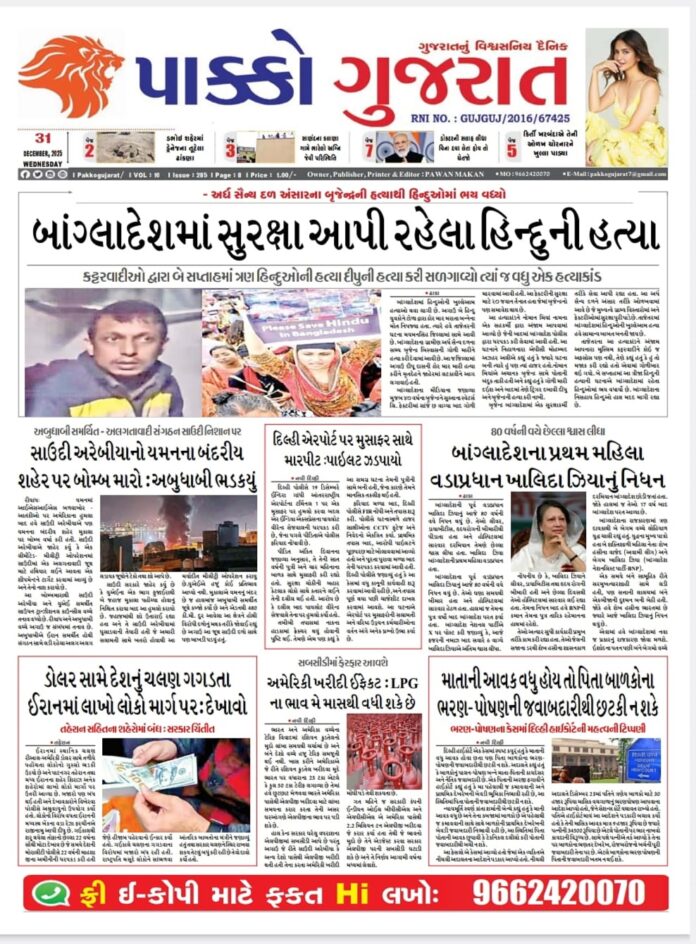 HomeepaperPAKKO GUJARAT : 31-12-2025 PAKKO GUJARAT : 31-12-2025 By pakkogujarat December 31, 2025 0 653 Share FacebookTwitterPinterestWhatsApp PAKKO_GUJARAT_31-12-2025Download Share FacebookTwitterPinterestWhatsApp Previous articleAnkleshwar : કાયદાકીય લડતમાં મંજુલાબેન પટેલની જીત: ₹1.16 કરોડના ઉચાપત કેસમાં સ્ટે બાદ પુનઃ સરપંચ પદે બિરાજ્યાNext articleBharuch : ભારે બંદોબસ્ત વચ્ચે હાંસોટમાં દબાણ હટાવો ઝુંબેશ: 68 ગેરકાયદે બાંધકામો પર ફરી વળ્યું બુલડોઝર pakkogujarathttps://pakkogujarat.com/ RELATED ARTICLES epaper PAKKO GUJARAT : 02-03-2026 March 2, 2026 epaper PAKKO GUJARAT : 01-03-2026 March 1, 2026 epaper PAKKO GUJARAT : 28-02-2026 February 28, 2026 LEAVE A REPLY Cancel reply Comment: Please enter your comment! Name:* Please enter your name here Email:* You have entered an incorrect email address! Please enter your email address here Website: Save my name, email, and website in this browser for the next time I comment. - Advertisment - Most Popular Entertainment : ‘મારે ઘરે જવું છે…’, યુદ્ધ વચ્ચે અબુ ધાબીમાં ફસાઈ બોલિવૂડ એક્ટ્રેસ, UAE સરકારના કર્યા વખાણ March 2, 2026 Valsad : વાપીમાં રીક્ષામાંથી 13.730 કિલોગ્રામ ગાંજાનો જથ્થો પકડાયો : પાંચની ધરપકડ, બે વોન્ટેડ March 2, 2026 National : ખામેનેઈના મોત મુદ્દે જમ્મુ-કાશ્મીરમાં હિંસક દેખાવો, ટોળાને વિખેરવા લાઠીચાર્જ, ટિયર ગેસના શેલ છોડ્યા March 2, 2026 Delhi : ઈરાન-અમેરિકા યુદ્ધની અસરને પગલે અમેરિકન દૂતાવાસ ખાતે સુરક્ષા વધારી દેવાઈ, ચુસ્ત બંદોબસ્ત ગોઠવાયો March 2, 2026 Load more Recent Comments