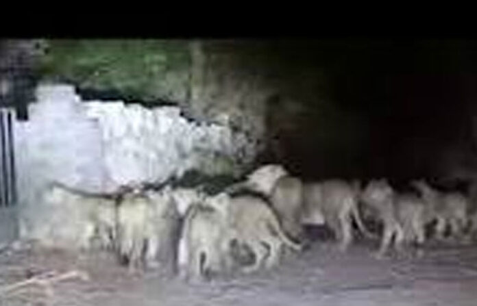 છતડિયા નજીક જ્યારે સિંહોનું આ ટોળું રોડ ક્રોસ કરી રહ્યું હતું ત્યારે ફરજ પરના વનકર્મીઓએ સમયસૂચકતા વાપરીને હાઈવેની બંને બાજુનો વાહનવ્યવહાર થંભાવી દીધો હતો. જ્યાં સુધી તમામ 11 સિંહો સલામત રીતે રોડ ક્રોસ ન કરી ગયા ત્યાં સુધી વનકર્મીઓ ત્યાં ખડેપગે રહ્યા હતા અને સિંહોને રક્ષણ પૂરું પાડયું હતું. 11 સિંહો શાંતિથી એક પછી એક રોડ ક્રોસ કરતા હોવાનો વીડિયો હાલ સોશિયલ મીડિયામાં ખૂબ વાયરલ થઈ રહ્યો છે.જયારે અન્ય એક ઘટનામાં ધારી ગીર પંથકના મીઠાપુર નક્કી ગામે એક લગ્ન પ્રસંગનું તમામ કામકાજ પૂર્ણ થઈ ગયું હતું અને મંડપ ખાલી હતો, ત્યારે રાત્રિના સુમારે એક કદાવર દીપડો શિકારની શોધમાં ગામમાં ચડી આવ્યો હતો. સોશિયલ મીડિયામાં વાયરલ થયેલા સીસીટીવી ફૂટેજમાં સ્પષ્ટ જોઈ શકાય છે કે, શણગારેલા મંડપની વચ્ચે દીપડો નિરાંતે આંટાફેરા કરી રહ્યો છે. જાણે તે કોઈ મહેમાન હોય તેમ મંડપમાં ફરી રહ્યો હતો. આ દ્રશ્યો સામે આવતા ગ્રામજનોમાં ફફડાટ ફેલાયો છે.