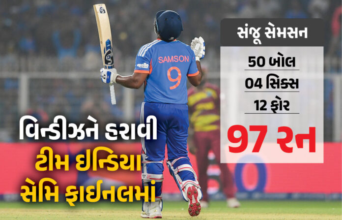 ટી20 વર્લ્ડકપમાં સુપર-8ની મેચમાં આજે ભારતે વેસ્ટ ઈન્ડિઝને હરાવીને સેમિ ફાઈનલમાં એન્ટ્રી કરી લીધી છે. વેસ્ટ ઈન્ડિઝે પ્રથમ બેટિંગ કરીને નિર્ધારીત 20 ઓવરમાં ચાર વિકેટે 195 રન નોંધાવ્યા હતા, જેના જવાબમાં ટીમ ઈન્ડિયાએ સંજૂ સેમસનની વિસ્ફોટ બેટિંગના કારણે 5 વિકેટે 199 રન નોંધાવી જીત મેળવી છે. હવે ભારત તેની સેમિ ફાઈનલ મેચ ઈંગ્લેન્ડ વિરુદ્ધ રમશે.