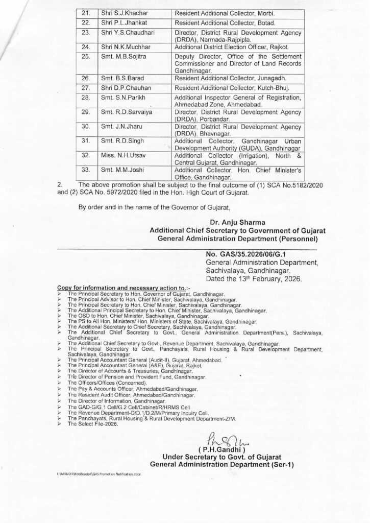 33 GAS officers Promotion: રાજ્યના મહેસૂલ વિભાગના મોટા સમાચાર સામે આવી રહ્યા છે. ગુજરાત સરકારે રાજ્યના વિવિધ જિલ્લાઓ અને વિભાગોમાં ફરજ બજાવતા ગુજરાત એડમિનિસ્ટ્રેટિવ સર્વિસ (GAS) કેડરના 33 સિનિયર અધિકારીઓને પ્રમોશન આપ્યું છે. સામાન્ય વહીવટ વિભાગ (GAD) દ્વારા આ અંગેનું સત્તાવાર નોટિફિકેશન બહાર પાડવામાં આવ્યું છે.