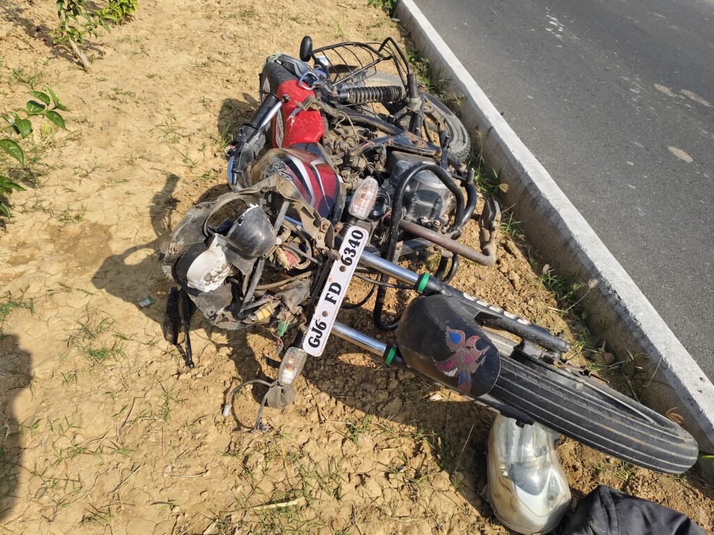 ઘટનાસ્થળે જ કરુણ મોત:આ ગમખ્વાર અકસ્માતને પગલે મોટરસાયકલ ચાલક રમેશભાઈને માથામાં જમણી બાજુ, મોઢા પર અને શરીર તથા પગના ભાગે ગંભીર ઈજાઓ પહોંચી હતી. આ ઈજાઓ એટલી જીવલેણ હતી કે રમેશભાઈ વસાવાનું ઘટનાસ્થળે જ કમકમાટીભર્યું મૃત્યુ નીપજ્યું હતું.અકસ્માત બાદ આસપાસના લોકો એકઠા થઈ ગયા હતા અને પોલીસને જાણ કરવામાં આવી હતી. પોલીસે તાત્કાલિક ઘટનાસ્થળે પહોંચીને કાયદેસરની કાર્યવાહી હાથ ધરી હતી.