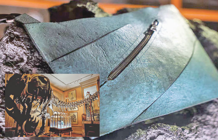 મ્યૂઝિયમમાં એક પાંજરામાં પથ્થર પર આ બેગને મુકવામાં આવી છે. ૧૧મી મે સુધી આ બેગને પ્રદર્શનીમાં રાખવામાં આવશે. જોકે આ બેગ સંપૂર્ણપણે ડાયનાસોરના ચામડામાંથી બનાવવામાં નથી આવી પરંતુ ડાયનાસોરના જે અંશો મળી આવ્યા હતા તેનો ઉપયોગ કરીને ચામડાનો લેબમાં વિકાસ કરવામાં આવ્યો હતો, વૈજ્ઞાાનિકોએ ટી-એક્સના જીવાશ્મોમાં બહુ જ જુના પ્રોટિનના નાના ટુકડા કર્યા હતા, આ ટુકડાને જેનેટિક એન્જિનિયરિંગની મદદથી એક અજ્ઞાાત પશુની કોશિકામાં નાખ્યું હતું, જેનાથી અંતે કોલેજન પ્રોટિન તૈયાર કરાયું હતું, જે બાદમાં ચામડામાં ફેરવાઇ ગયું હતું.